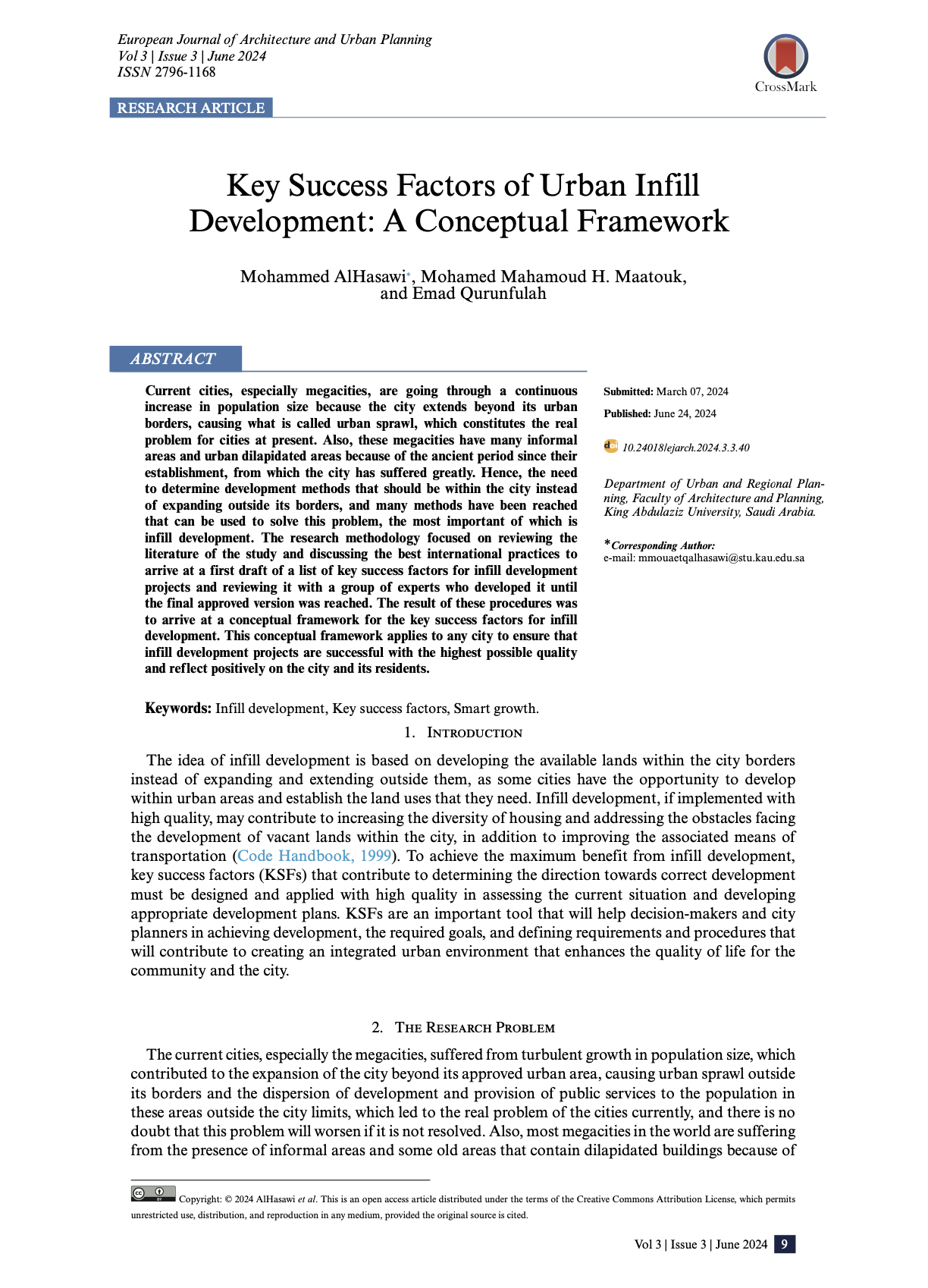The research methods revealed two basic problems that cities suffer from, which are urban sprawl and informal areas, where the need has become clear to apply infill development as one of the appropriate development methods. The methodology was focused on reviewing the study literature and international best practices to arrive at a conceptual framework for the KSFs for infill development projects (Smart Growth, 2017). The research goal was achieved by creating a conceptual framework that is based on reviewing the study’s literature and discussing the best international practices related to KSFs and infill development. This conceptual framework consists of 13 KSFs that can be applied in infill development projects, and a careful evaluation of them was conducted by specialized experts in urban planning who participated in the structured interview. Positive results were achieved that support what was concluded. The research recommends using this conceptual framework for infill development projects or similar tools, as they should be activated and used to evaluate the current situation and develop plans for implementing infill development projects in the city, explore defects and problems, and make appropriate decisions and actions. (Smart Growth, 2017).