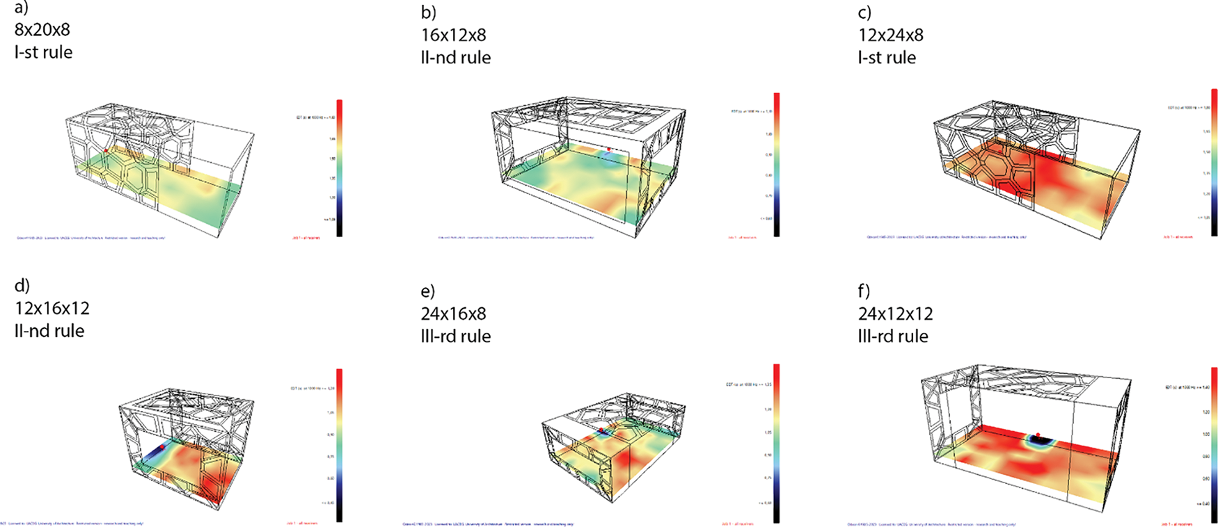 In Fig. 9, the selected rooms are displayed with a color grid analysis of the EDT from Odeon. Volumes c) and a) resemble the I-st rule of proportion, where the materials are not evenly distributed on the surfaces and absorption is mainly focused on the back of the room. This results in a louder front and quiet back, with no reflections that contribute to the main sound. The second rule, volumes b) and d), has a more even distribution of materials and more reflections from the lateral walls, leading to even sound distribution in the rooms. The third rule, volumes e) and f), has a somewhat similar distribution except for the two ends of the back wall and ceiling towards the side walls. Here, we can see a decline in the EDT, mostly in the corners of the rooms, but otherwise a homogeneous soundscape.