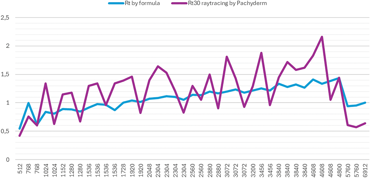 Fig. 8. Reverberation time in Pachyderm by raytracing versus Grasshopper algorithm.