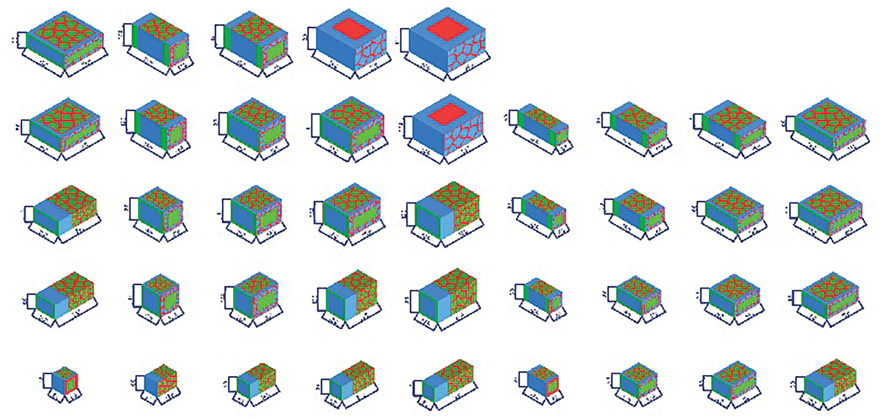 Following the rules described in Tables II and III, Grasshopper modelled all the materials as preconditioned. All generated acoustic treatments are presented in Fig. 3. Some of the results are shown in Figs. 4–6, where blue is absorption, green is reflection, and red is diffusion.