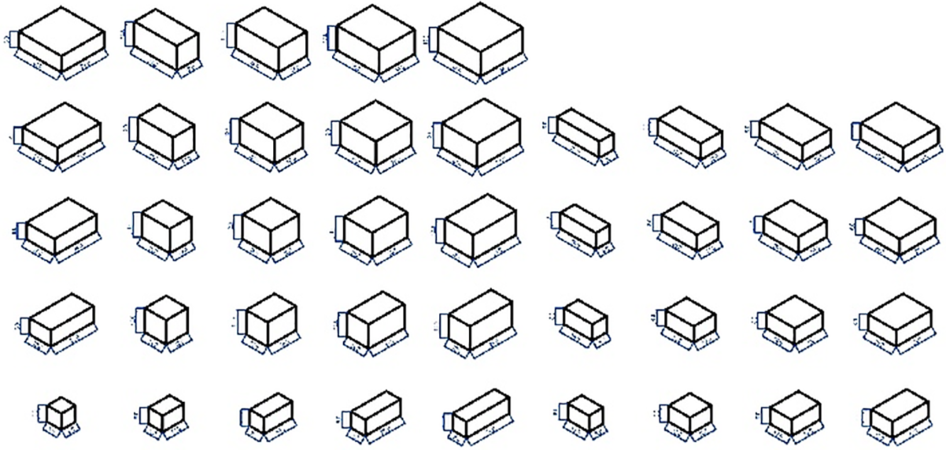 To conduct the experiment, 41 rooms were generated, with basic “shoebox” shapes and volumes varying between 500 m3 and 7000 m3. The “shoebox” design was selected for its common use as easily implemented in architectural idea layout and lower construction values of the shape. For each of the generated rooms, the initial materials were the same: wooden floors, plaster walls, and plaster ceilings. The absorption coefficients of these materials were applied to the first RT calculation based on Wallace Sabine’s formula. The definition of the spaces by their dimensions of length(y), width(x), and height(z) was made by combinations according to Table I. Of all 50 possible combinations, nine were excluded based on z>x or z>y, as those proportions are more unlikely to be used. In Fig. 1, All generated volumes are presented.